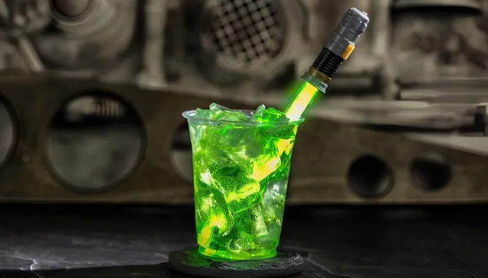 - Chosen One Cooler: Una mezcla refrescante de manzana Granny Smith, jugo de arándano blanco y jugo de lima, servida con un agitador recargable de sable de luz verde de Luke Skywalker. También existe versión con vodka Absolut Citron. Una bebida perfecta para coleccionistas y fans de Luke. 💚